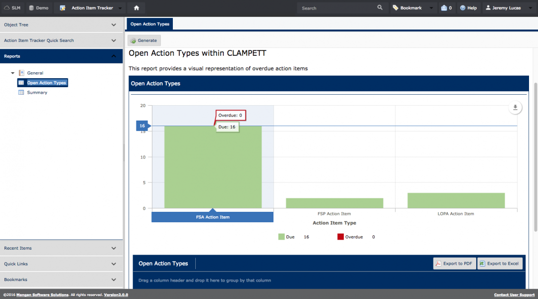 The following Data and Reports are part of the SLM V2 core Action Item Tracker Module.