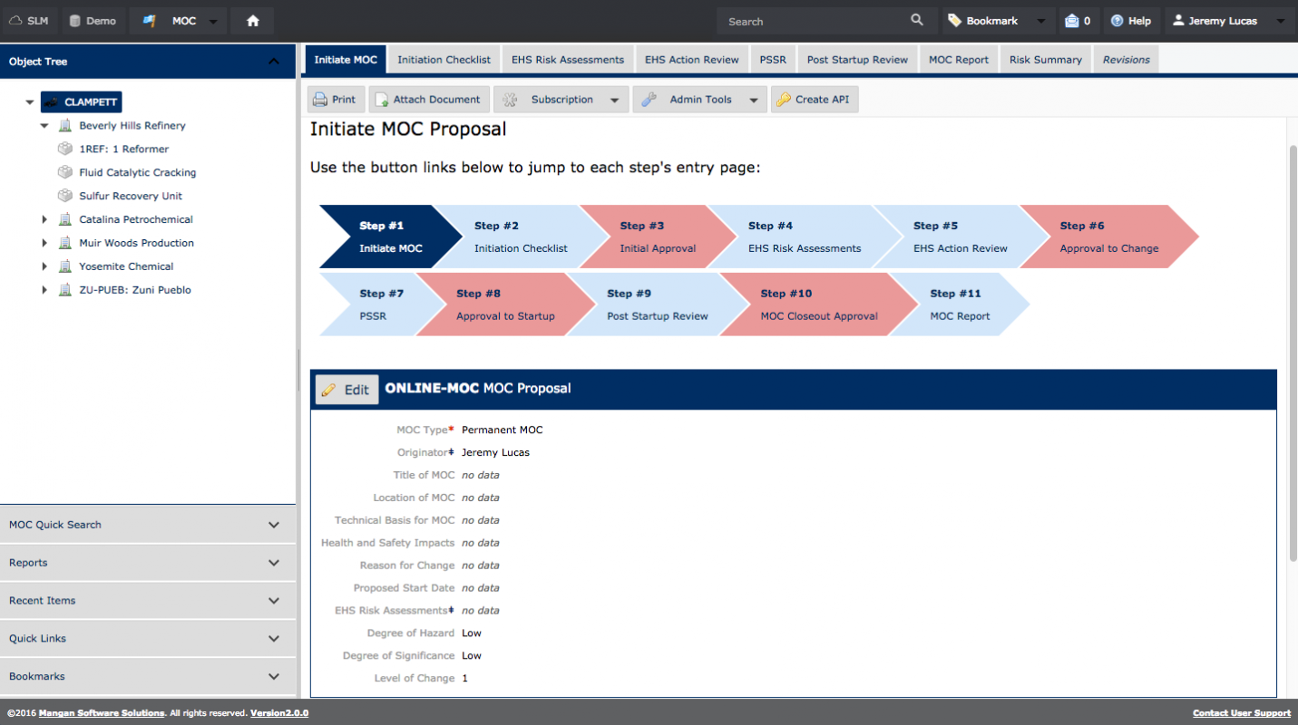 The MOC Module standardizes a 10-step approach to the Change Management process. The software workflows provide tools which facilitate the evaluation and control of design modification, operation, technology, facilities, equipment, or procedures. Advance through the MOC with the required checklists, assessments, reviews, and approval processes, all generated within MOC. Quick links to Process Safety Information within the other modules accelerates the MOC process and ensures accurate analysis of potential hazards. As with all other modules, the flexible SLM platform makes configuration fast and inexpensive.